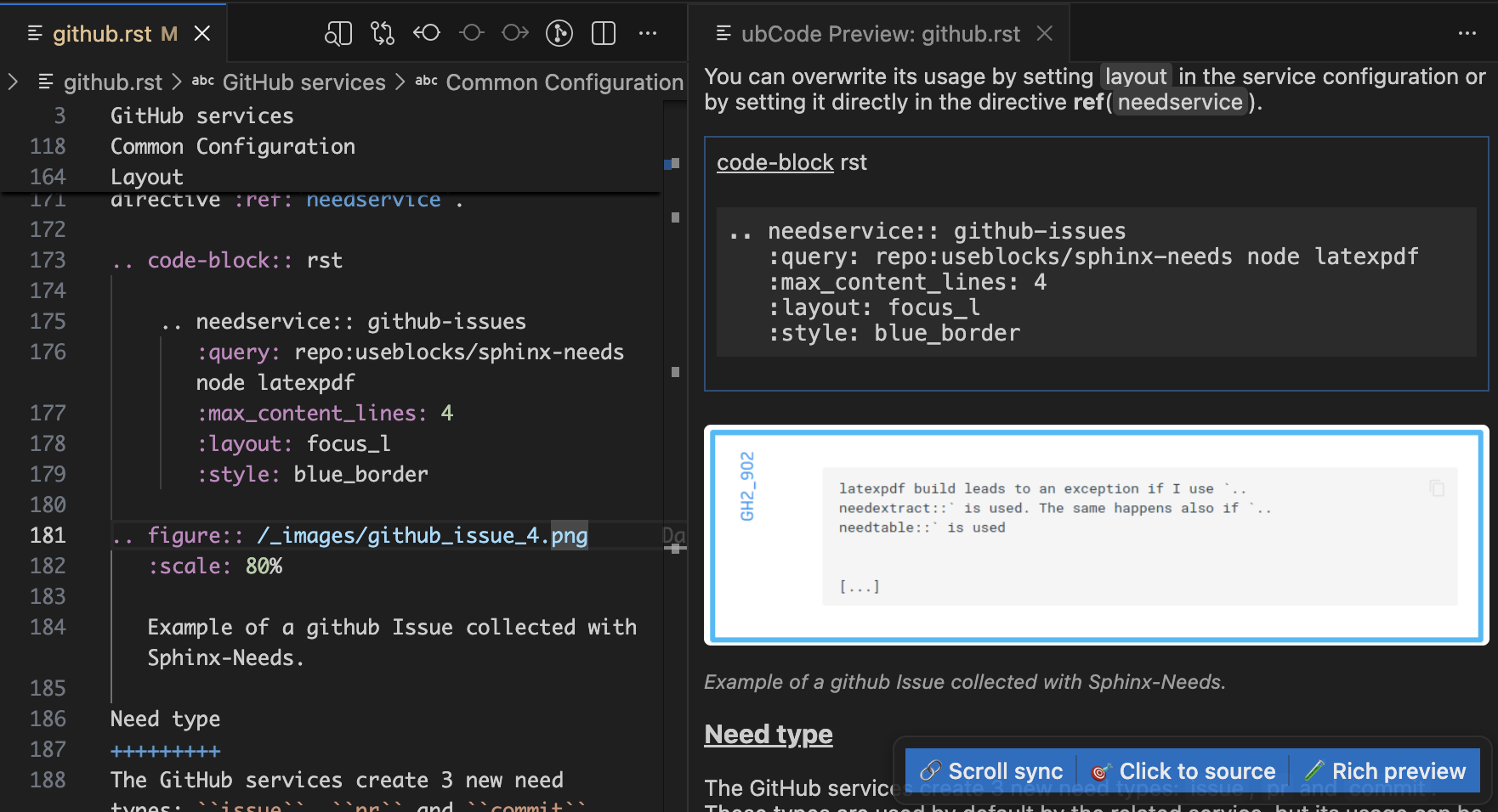 The extension integrates with Sphinx-Needs via a new ubproject.toml file format. The new needs index can be used to navigate to needs without running a Sphinx build.